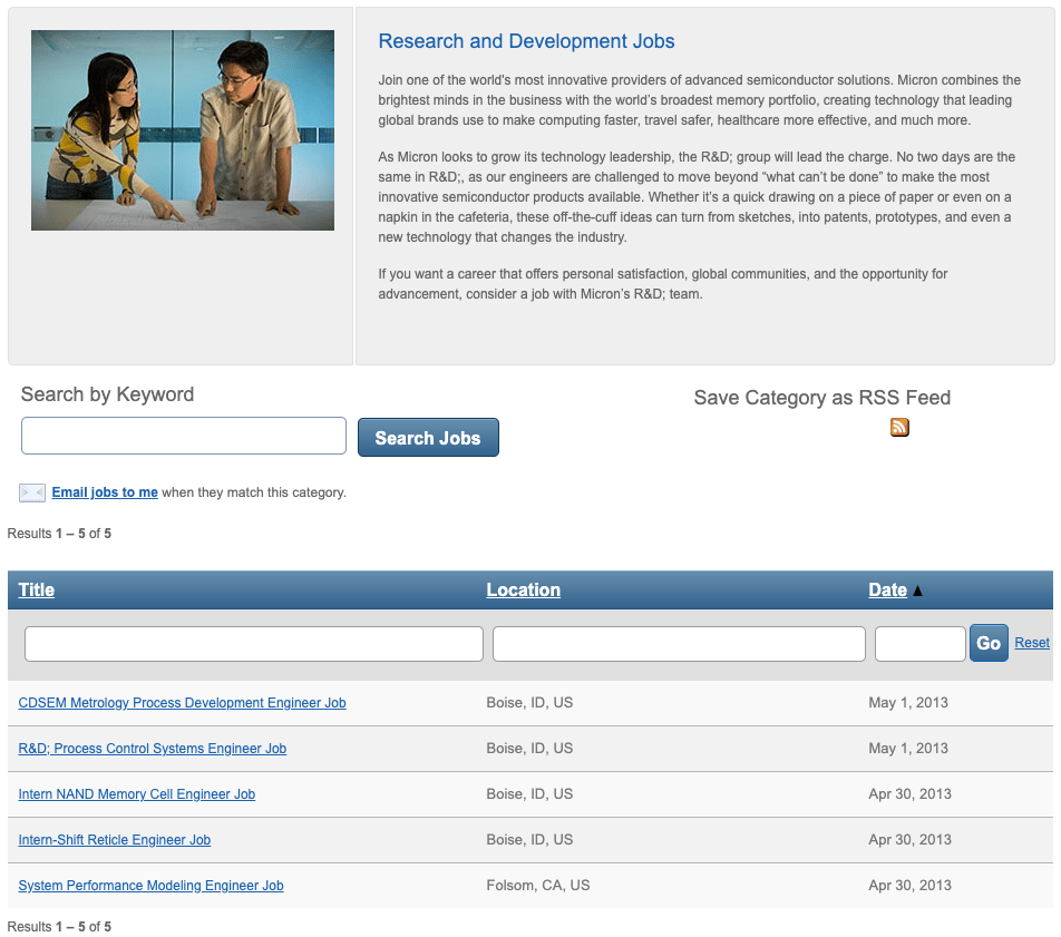 Micron’s careers page in 2013 and 2014 was unmistakably the world of a DRAM foundry. The listings were dominated by roles like CDSEM Metrology Process Development Engineer in Boise, Process Control Systems Engineer in Boise and Intern NAND Memory Cell Engineer in Boise — all focused on wafer-level precision, yield optimization, and process reliability. Even the entry-level jobs, such as Intern-Shift Reticle Engineer in Boise, Idaho, pointed to the same thing: a culture centered on the tools and techniques of the fab. The one outlier — a System Performance Modeling Engineer in Folsom, California — was a sliver of what was to come, but at the time it was buried among postings about metrology and reticle shifts. Customers, workloads, and software were nowhere to be found. Micron’s engineers lived inside the fab, competing on cost per bit and incremental yield gains.