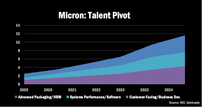 Hiring by role type shows Micron’s pivot from fab-bound process jobs toward advanced packaging, software-aware performance, and customer-facing roles. Figures use an Epistrophy Capital Research index and exclude Boise-dominant fab postings. These are the thin but strategic hires that put Micron engineers shoulder-to-shoulder with GPU vendors and operating software developers.