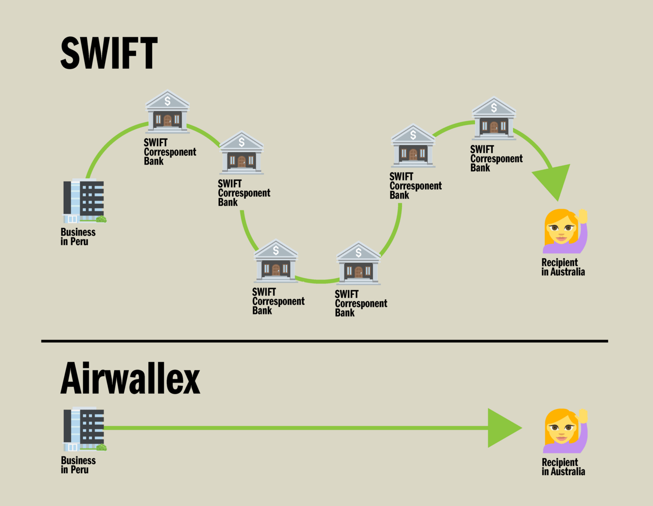 To understand why Airwallex matters, you have to understand how bad the status quo is. SWIFT isn’t a payments network. It’s a messaging protocol—a way for banks to send instructions to each other to move money. But those messages are only part of the story. A typical international transfer might go through six financial institutions. A business in Arequipa, Peru tells its local bank to send money to a supplier in Perth, Australia. That bank doesn’t have a direct relationship with the Australian bank, so it routes the payment through a correspondent in Lima to another in Mexico City, to another in New York to another in Melbourne before finally getting to the recipient in Peru. Each hop adds time, fees, and a fresh layer of compliance friction. That’s not theoretical—those delays are measured in days, not minutes.