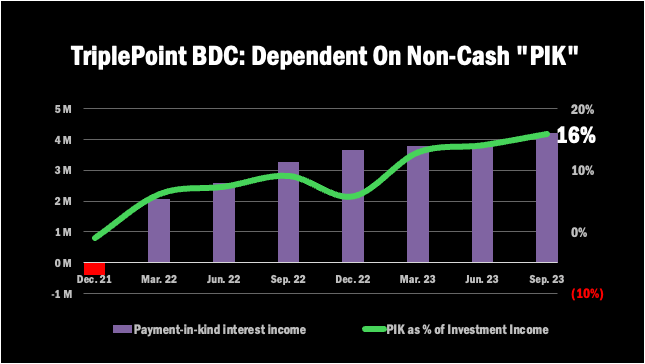 TriplePoint’s reliance on aggressive fair value adjustments and a growing proportion of non-cash income, particularly payment-in-kind (PIK) interest, masks underlying cash flow issues. Net investment income per share has declined, while PIK income has jumped from 6% in March 2023 to 16% last quarter. This widening gap between reported earnings and actual liquidity cannot hold—setting the stage for a significant dividend cut.