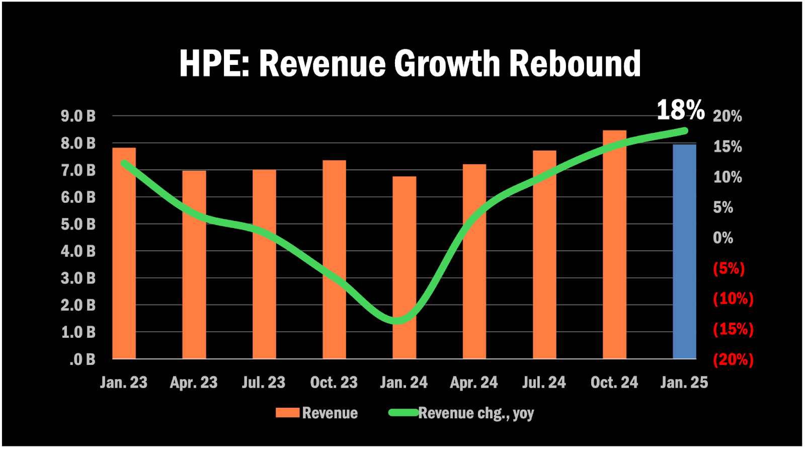 But who cares about estimates, really? The real story is that HPE has quickly carved out a dominant position in AI infrastructure, fueling record quarterly revenue of $8.5 billion in Q4 2024, up 15% year-over-year. AI systems revenue hit $1.5 billion last quarter, a 16% sequential increase, with backlog exceeding $3.5 billion. HPE’s AI business remains resilient despite a puzzling $700 million order "de-book" last quarter (a mystery we wrote about on December 8, 2024). HPE cited unspecified "risk" as the reason, but bookings rebounded post-quarter, bringing AI backlog back to $3.5 billion.