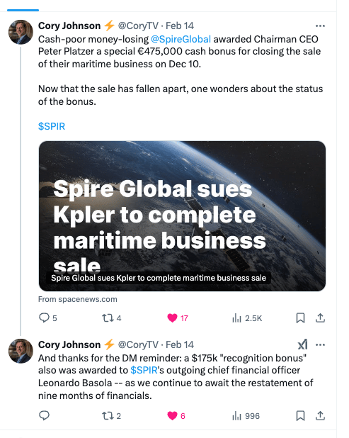 Amid technical failures, Spire's governance raises eyebrows. In December 2024, with the company already distressed, the board approved €475,000 for Platzer and $195,000 for his outgoing CFO Leo Basola as special bonuses for their work on the uncompleted maritime sale.