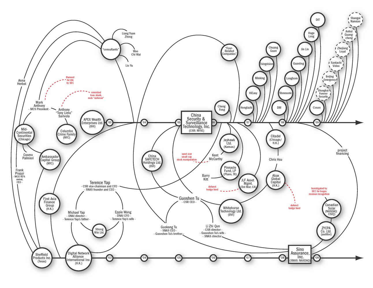 These hand-drawn networks proved invaluable, and eventually I started making them in Adobe Illustrator for investigations into companies such as China Security & Surveillance Technology (CSR: NYSE), Groupon (GRPN: NASDAQ), and Houston American Energy (HUSA: Nasdaq). Each investigation reinforced Lombardi's core insight: visual mapping reveals patterns that spreadsheets obscure.